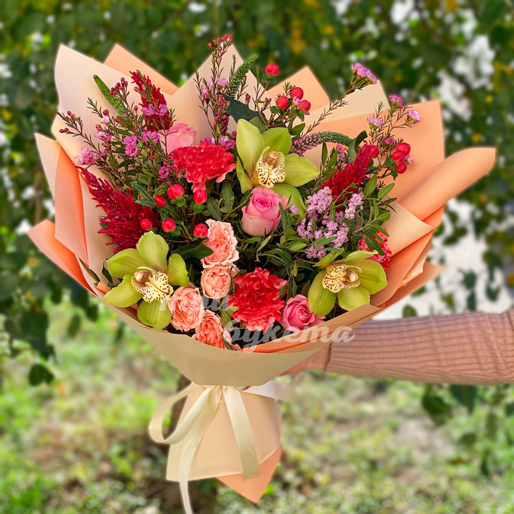 Букет из орхидей, роз и аспарагуса