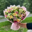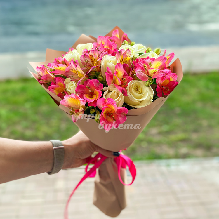 Букет розовых альстромерий и кремовых роз