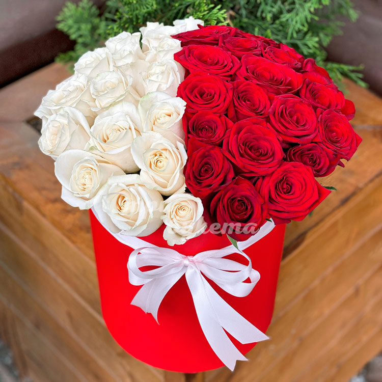 Коробка с красными и белыми розами