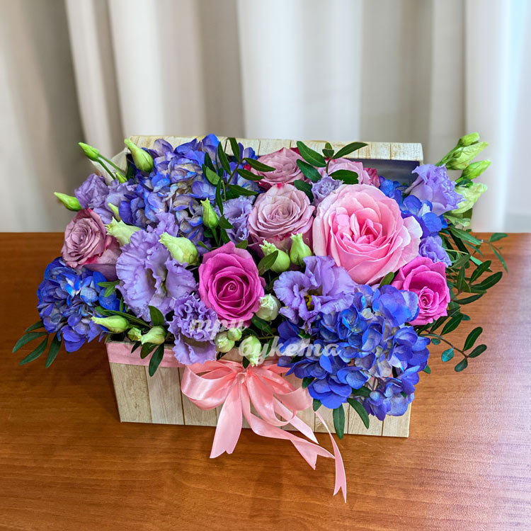 Коробка синих гортензий и розовых роз