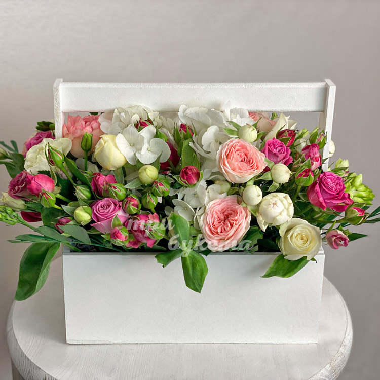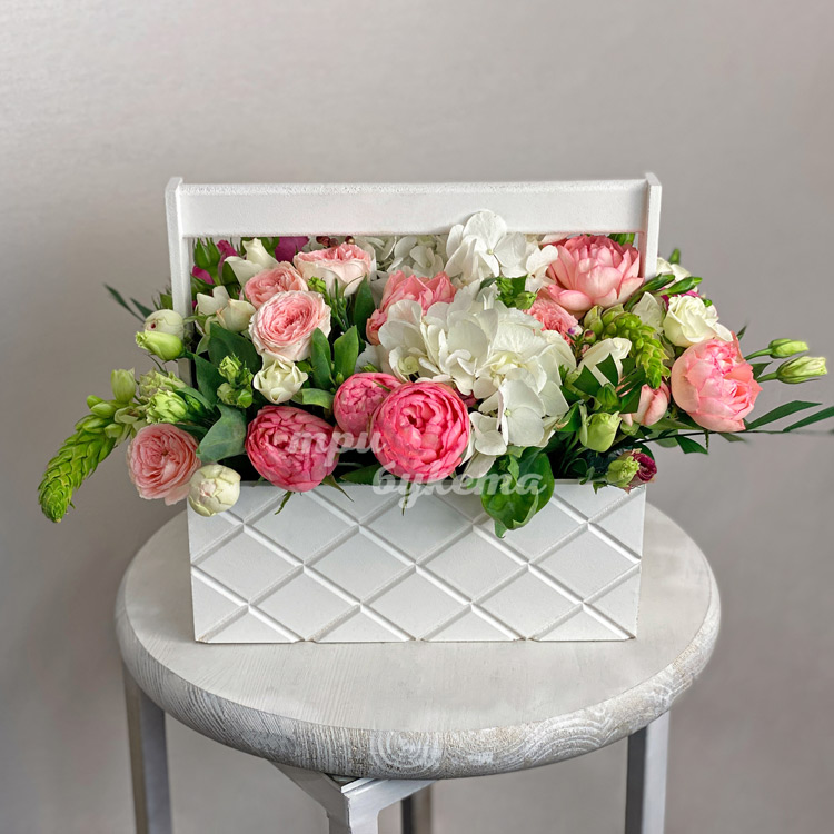 Пионовидные розы и гортензии в ящике