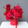 Яркая коробка роз, гвоздик и маттиол