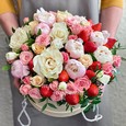 Яркие гвоздики и хризантемы в коробке